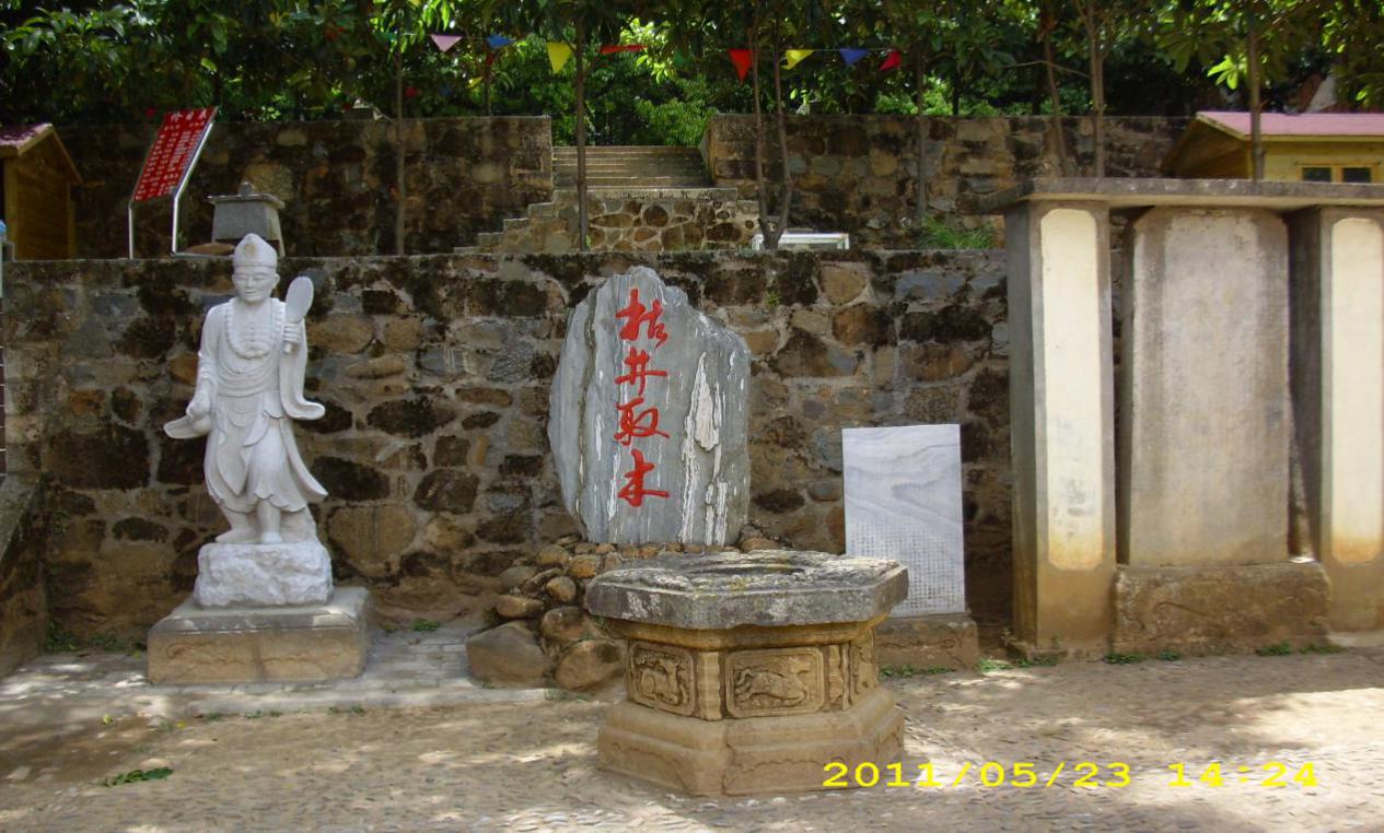 水目勝景九龍壁?!熬琵垺笔腔首宓南笳?。大理國時(shí)期,舉國信佛,22位國主中,竟有10位避位為僧。而水目山成為除當(dāng)時(shí)的皇家寺院(崇圣寺)之外唯一有王公貴族出家的名山(當(dāng)時(shí)稱為皇家禪林)。水目山原名寶華山,唐朝憲宗元和八年,即南詔龍興四年(公元813年)西南地區(qū)巫術(shù)群起,鬼主猖獗,南詔為了擊敗割據(jù)一方互不統(tǒng)屬的大小鬼主,利用外來佛教,把它當(dāng)作實(shí)現(xiàn)政治統(tǒng)一、政教合一的精神武器,尊為國教,于是派大德高僧普濟(jì)慶光禪師到水目山主持開山建寺,并賜宮中護(hù)寶錫杖。相傳普濟(jì)禪師入山之初,觀此山山勢(shì)雄奇,林木幽秀,萬山如拱。遠(yuǎn)遠(yuǎn)望去,猶如一尊彌勒大佛跏趺原野,云蒸霞蔚,氣象萬千,但山上缺水。后來普濟(jì)到了一青草洼地處,他想“此地應(yīng)出水啊”。于是情不自禁地舉起宮中護(hù)寶錫杖,朝一塊低洼的草地上奮力一戳,將錫杖插在地上,并在錫杖下跏趺而坐,閉目入禪。不料,一時(shí)竟難以入定,口中自然而然地念起《金剛經(jīng)》和《大悲咒》來。念了一遍又一遍,念得口干舌燥,還是未能入定??纯刺焐辉缌?,普濟(jì)只好起身。可是,就在他漫不經(jīng)心地拔出錫杖之時(shí),一股清泉咕嘟嘟冒了出來,泉水越涌越旺,清澈透明,仿佛眼睛,因而得名“目”。以后此山就命名為水目山,此泉就稱為“錫杖泉”,至今錫杖泉還在?!八縿倬场彼膫€(gè)字是由中國佛協(xié)會(huì)原會(huì)長趙樸初先生親筆題寫的。