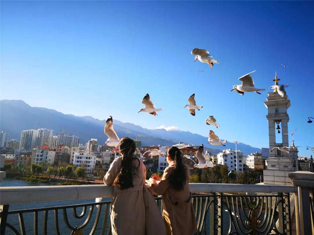 如果是冬天,水柳葉子落盡,瘦俏的枝條靜默在天地間,與遠山近水一起,成為畫師難描的淡墨畫。那時洱海更藍,深藍,天空像一面幽藍的湖水,倒扣下來,絲絲縷縷的藍,仿佛可以一把把撕扯下來。這個季節(jié)漫步洱海邊,水鳥多起來了,它們都是千里迢迢來越冬的,陽光下探出黑色的小腦袋,隨著海浪輕輕起浮,怎么看都看不夠。