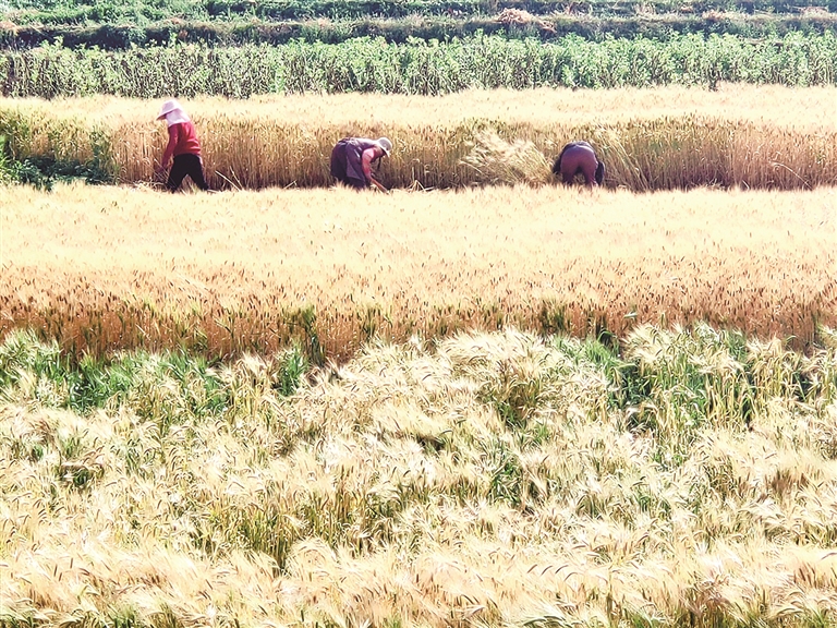 4月3日,巍山縣永建鎮五茂林村的村民在收割小麥。