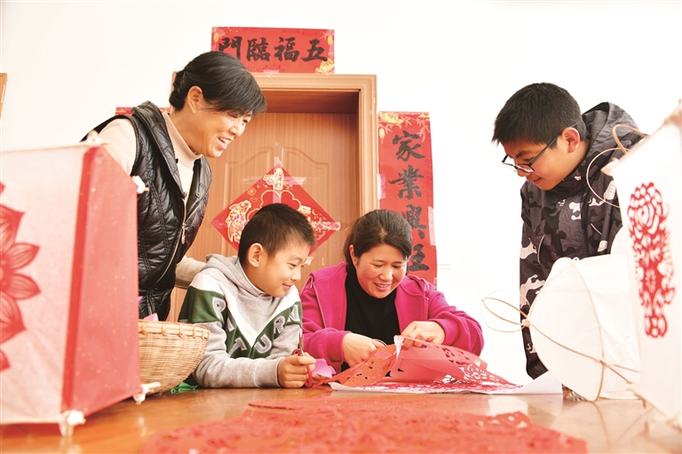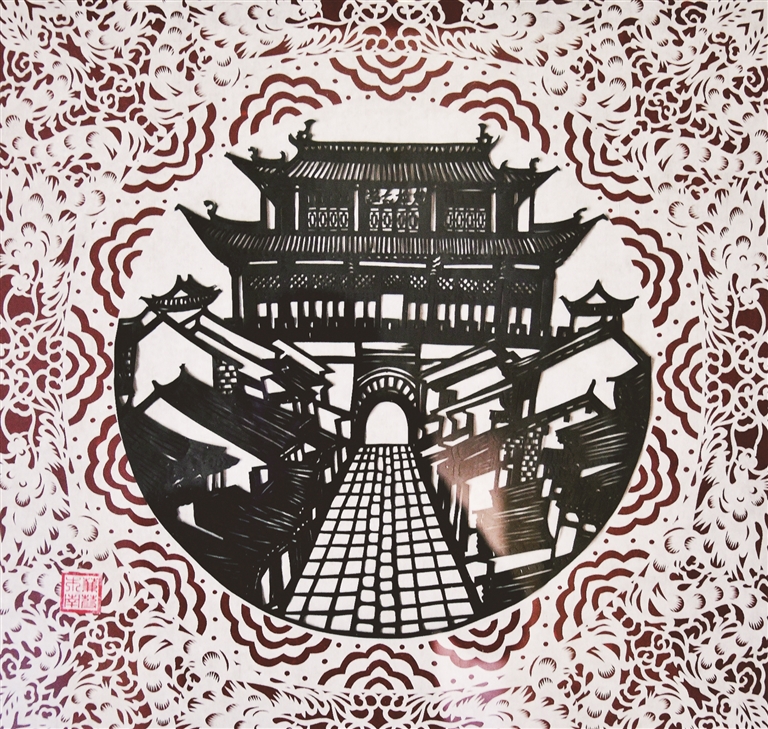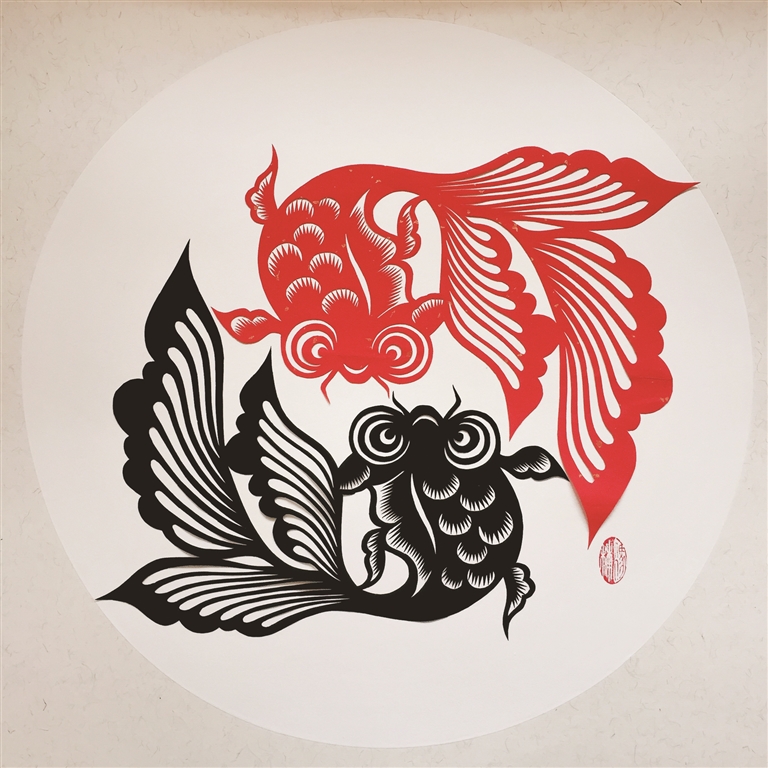 “剪紙講究一定的方式方法,否則一個很小的失誤,就會讓自己的作品功虧一簣?!瘪T楠邊說邊舞動著手中的剪刀,隨著紙屑飄落,她手中上下翻飛如舞蹈般的剪刀也停了下來。不一會兒,一個紅彤彤的帶有“?!弊值募艏?,便赫然展現在了人們眼前,而四周鏤空的蝴蝶、蝙蝠和蜘蛛的圖案,寓意著喜氣和吉祥。