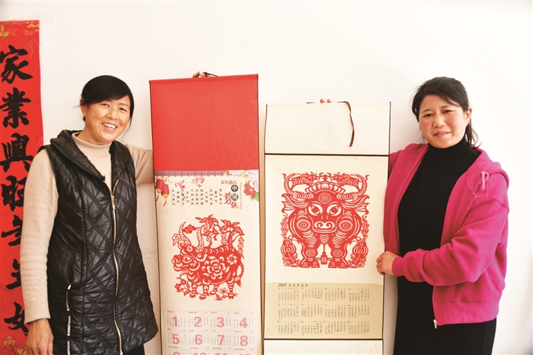2021年春節,巍山縣南詔鎮雞碧村委會小后廠村,現年39歲的馮楠在給幾個侄兒做元宵節玩的燈籠,而掛在客廳里的掛歷,也是她親手制作的,那上面的剪紙,是金牛獻瑞的圖案。