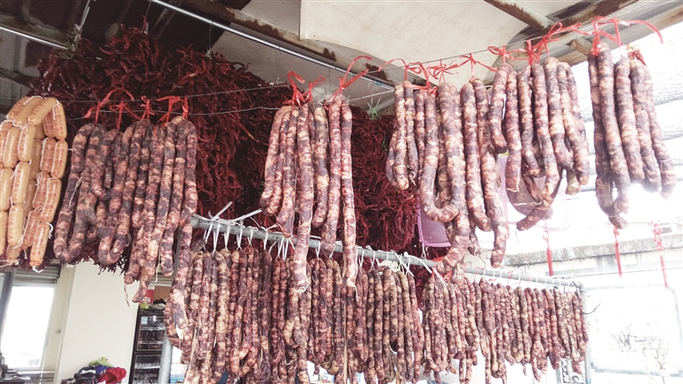 這時候原料就會順著出口緩緩注入準備好的腸子內,小心翼翼地用手指一截一截地順,就灌進去了,擠壓緊實,讓原本癟癟的腸子如吹了氣一般慢慢變得飽滿。灌好的豆腐腸水分很多,需要多天的晾曬。接下來的日子就會看到家家戶戶的門頭上、屋檐下掛著一串串鼓脹脹的腸子,它們給原本就熱鬧的院子增添了一抹獨特的韻味,隨著早晚氣溫變化,成就了老家的美食。