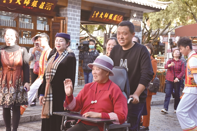 11月16日上午11時,一場“千里赴山海,只為你而來”的歡迎儀式在大理古城南城門口舉行,帶著患病母親徒步七千多公里圓夢大理的山東小伙彭廣華(大鵬)和他的母親是這場儀式的主角。