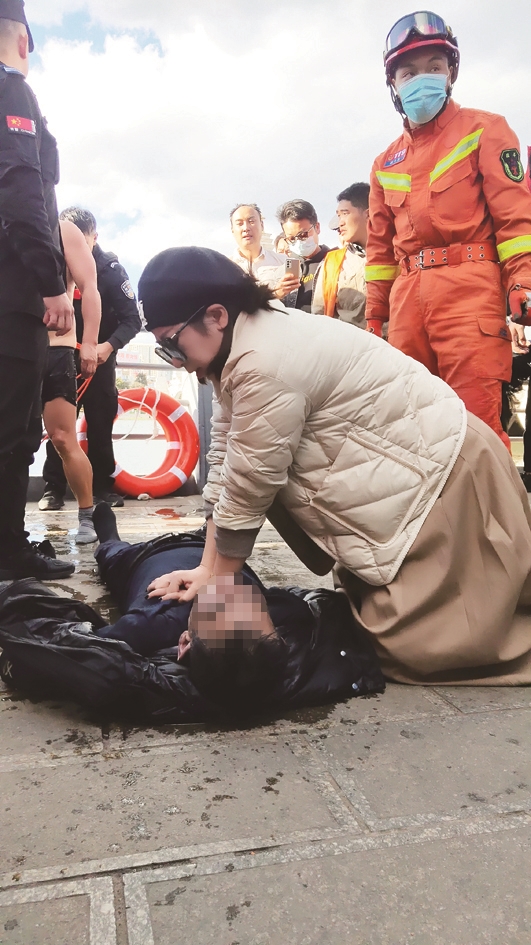 “快來人!他還有氣!”伴隨著張棟基的大聲呼喊,一個白色聲影從岸邊欄桿上跳入水中,飛快地向他們游去,和張棟基一起穩住落水者。緊接著,兩名游泳愛好者也背著救生圈從岸邊游來,幾人合力把落水者救上了岸。人救上來后,一名熱心女子還給落水者做了心肺復蘇。