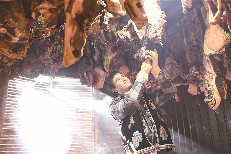 玉緒媽村海拔高、氣溫低,當地熏制臘肉的傳統已有幾百年的歷史,其獨特的腌制工序、烹飪技術讓當地的臘肉遠近聞名。茶正元也從中看到了商機,去年10月份,他開始了熏制臘肉,目前已宰殺熏制好了17頭豬,除在本地市場銷售外,還被上海、昆明等外地顧客預定了一部分,每頭豬熏制成臘肉后,純收入可達1500多元。