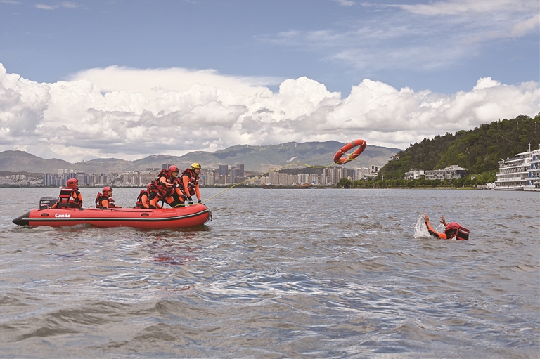 “因連續強降雨,某地水位迅速上漲,1名群眾被困孤島,3名群眾不慎落水,情況十分危急,上級命令中隊迅速出動救援!”5月26日,在大理市洱河北路的洱海水域訓練基地,大理州森林消防支隊直屬中隊開展了一場驚心動魄的水域救援訓練。