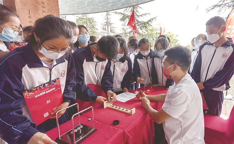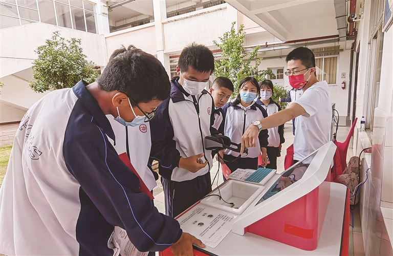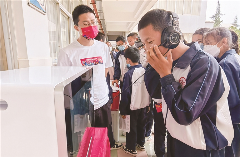 點擊按鈕,戴上VR眼鏡就可以“置身”于不同場景,學習使用滅火器,體驗實景災害逃生;對著話筒說一段話,聲音便像信件一樣郵寄給“收信”人;對著科學裝置發出指令,聲音就代替手指跑酷;在機器手面前做出石頭剪刀布的動作,就可以與機器手PK……記者在現場看到,同學們被“科技大篷車”里各種有趣的科技體驗深深吸引。這些有趣的科技互動體驗,覆蓋人工智能、航空航天、物理、地理、語文等,以及醫療急救、災害自救、民族文化等方面,讓同學們在“試一試、想一想”中過了一把“黑科技”癮。