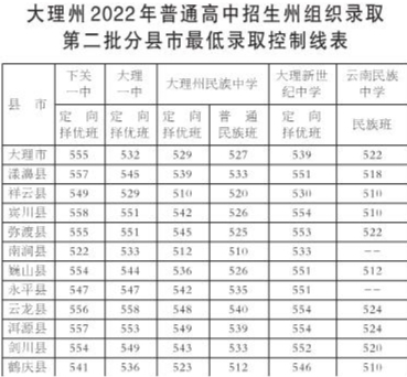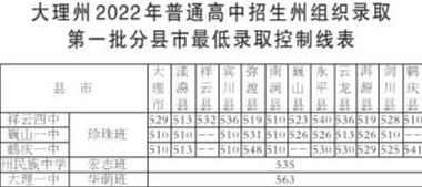 第一批為州民族中學“宏志班”、大理一中“華萌班”最低錄取控制線,祥云四中、巍山一中、鶴慶一中“珍珠班”分縣市最低錄取控制線。其中,州民族中學“宏志班”最低錄取控制線:535分;大理一中“華萌班”最低錄取控制線:563分。