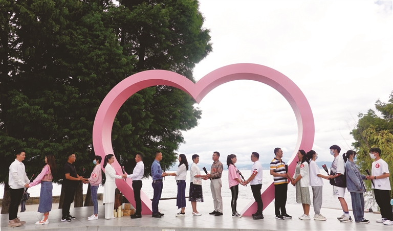 “七月的風(fēng),八月的雨,幸運(yùn)的我終于在這兒遇見(jiàn)心愛(ài)的你。邀蒼山為盟,洱海為誓,在這水波溫柔的八月,來(lái)赴一場(chǎng)愛(ài)的邀約。” 8月3日,在大理市龍龕古渡,33對(duì)情侶進(jìn)行愛(ài)情表白,他們中有結(jié)婚多年的夫妻,也有熱戀中的戀人。