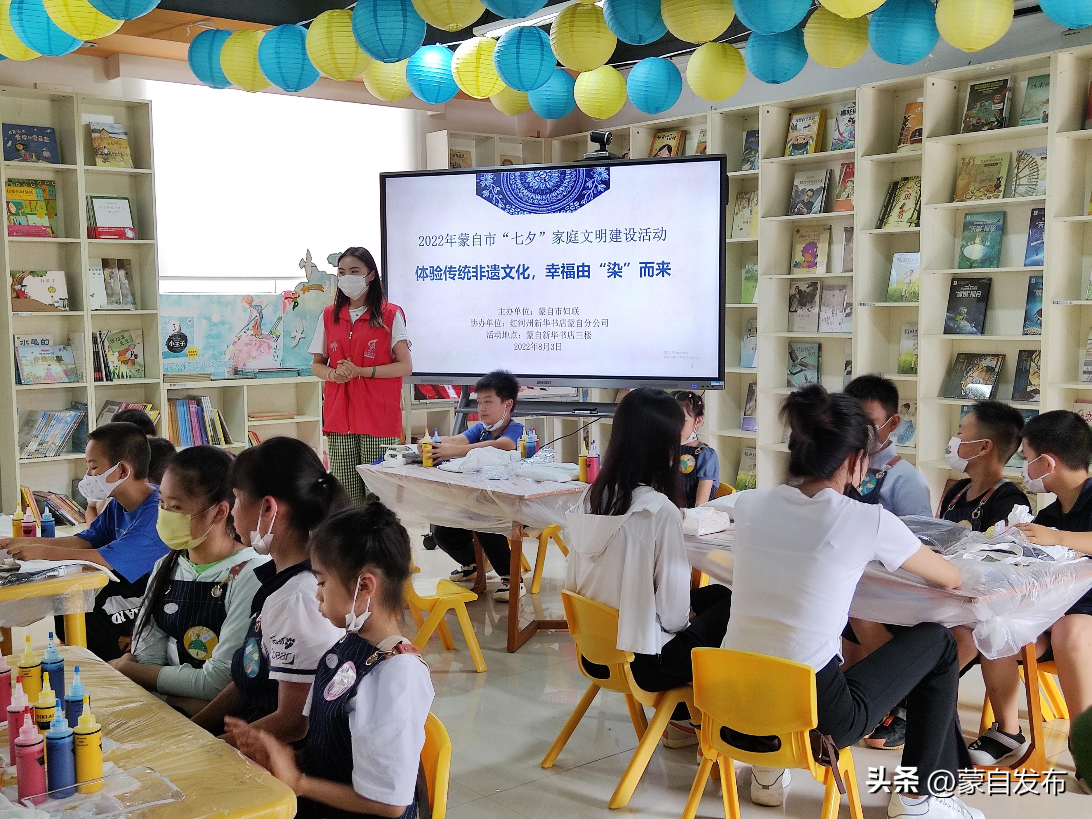 為了讓家長和孩子們了解中國傳統獨特的染色工藝,8月3日,市婦聯聯合新華書店開展主題為“體驗傳統非遺文化,幸福由‘染’而來”2022年蒙自市“七夕”家庭文明建設活動。