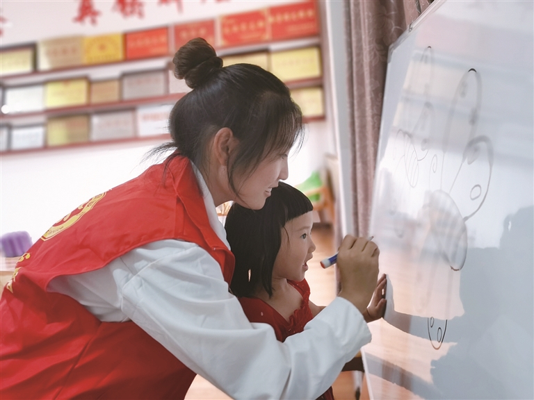 “這樣子順著畫過來,一只小蜜蜂就畫好啦!”8月1日,巍山縣南詔鎮日昇街社區第一期愛心托管班內,大學生志愿者正耐心教導小朋友繪畫。