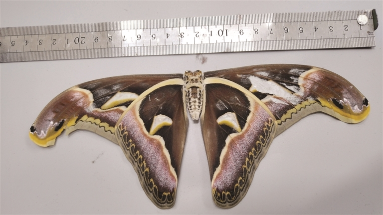 工作人員測量其翅展為23.5cm,經專家鑒定為冬青大蠶蛾,屬國家“三有”保護動物。冬青大蠶蛾是蛾類中的“巨無霸”,其外形奇特,長著一對巨大的翅膀,翅膀兩端呈蛇頭模樣。