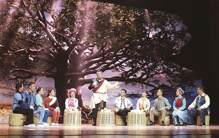 “石榴結籽,抱成團喲……”紗幕徐徐拉開,7個民族的村民用深情歌唱將七霞莊的美麗故事娓娓道來。
