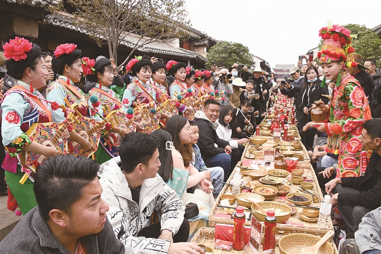 2月26日中午,極具地方特色的南詔養(yǎng)生宴在巍山古城開席,188張長(zhǎng)桌一字?jǐn)[開,傳統(tǒng)民族樂器現(xiàn)場(chǎng)演奏助興,美麗熱情的彝族姑娘唱歌敬酒,歷史文化名城里大家品鑒美食、聚朋會(huì)友……上千名游客共品養(yǎng)生宴成為巍山古城一道亮麗的風(fēng)景。 南詔養(yǎng)生宴是每年中國大理巍山小吃節(jié)“重頭戲”之一,多年以來深受食客們的贊譽(yù)。南詔養(yǎng)生宴是道教養(yǎng)生理論與傳統(tǒng)巍山素食的有機(jī)結(jié)合。本屆南詔養(yǎng)生宴菜品有長(zhǎng)春洞賓雞、古城春曉、吉祥素三寶、太極八寶飯等15個(gè)特色菜品,皆選用當(dāng)?shù)厣虾玫氖卟恕⑺炔牧暇呐胫贫伞? [特約記者 陸向榮 攝]