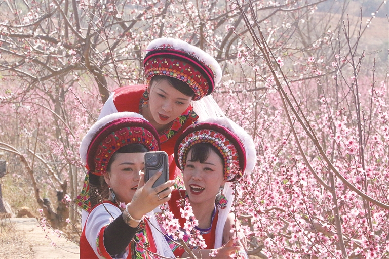 3月11日,首屆新興苴桃花節吸引了數萬游客紛至沓來,桃林深處,還有游客穿上白族服飾與桃花合影。