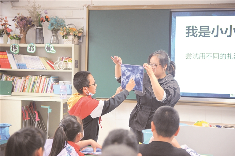 “我們二年級就開始學扎染了,我非常喜歡這門課程。不僅有趣,還學到了白族扎染的知識、了解到了家鄉的傳統手工藝。”160班學生樂原秀告訴記者,現在她已經學會扎出蝴蝶花,還會制作扎染頭繩,課堂上的作品,她會拿回家收藏留念。