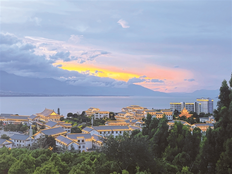站在大理聽風樓,透過落地窗遠眺蒼洱,落日余暉,霞光滿天,隨意按下快門,都是一幅動人的畫面。夜幕降臨,城市的燈光流光溢彩,越夜越美麗,將夜下關的氛圍感拉滿。