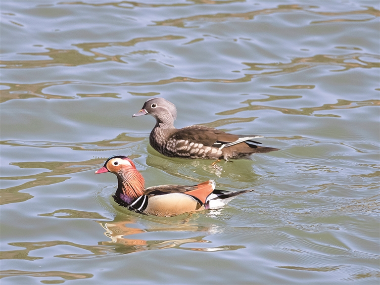 鴛鴦是國家二級重點保護野生動物,雌雄異色,雄鳥羽色鮮艷華麗,雌鳥羽色以灰白色為主。每年冬季,綠茵塘水庫都會迎來鴛鴦越冬,最多時達50多只,它們成雙成對、成群結隊,呈現出一幅人鳥共生和諧浪漫的畫卷,也為沉寂的冬天帶來了一抹生機與靈動。
