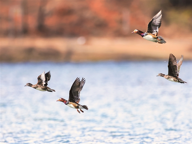 ① 鴛鴦在空中自由飛翔。(攝于1月6日)