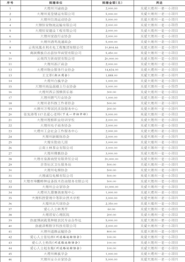 2023年8月起,大理州關(guān)心下一代工作委員會、大理州民政局、大理州慈善總會依托騰訊公益平臺開展“關(guān)愛大理州一老一小”線上線下公益募捐活動,社會各界紛紛捐款奉獻(xiàn)愛心。截至2023年12月31日,大理州慈善總會共收到社會各界愛心企業(yè)、人士、社會團(tuán)體捐贈資金994802.18元(其中:線上捐贈340855.52元,線下捐贈653946.66元)。線下捐贈明細(xì)如下:
