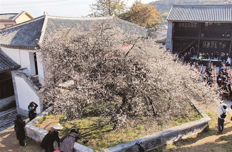 站在花壇邊,梅花香味更加濃郁,令人陶醉。這株800余年的元梅樹干粗壯有力,斑駁嶙峋,虬枝盤曲,枝節交錯,花苞、盛花掛滿枝頭,粉白相間,重重疊疊,引得蜜蜂、鳥雀飛舞其間,忙著采蜜、嬉戲……