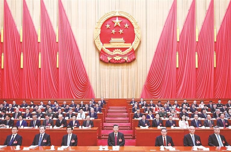 人民大會堂大禮堂氣氛隆重熱烈,主席臺帷幕正中的國徽在鮮艷的紅旗映襯下熠熠生輝。