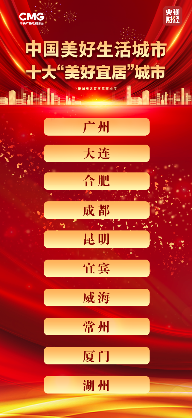 在《美好生活之夜》中,中央廣播電視總臺發(fā)布了年度美好煥新城市、年度美好文化城市、十大美好宜居城市,其中廣州、大連、合肥、成都、昆明、宜賓、威海、常州、廈門、湖州成為百姓眼中十大“美好宜居”城市。