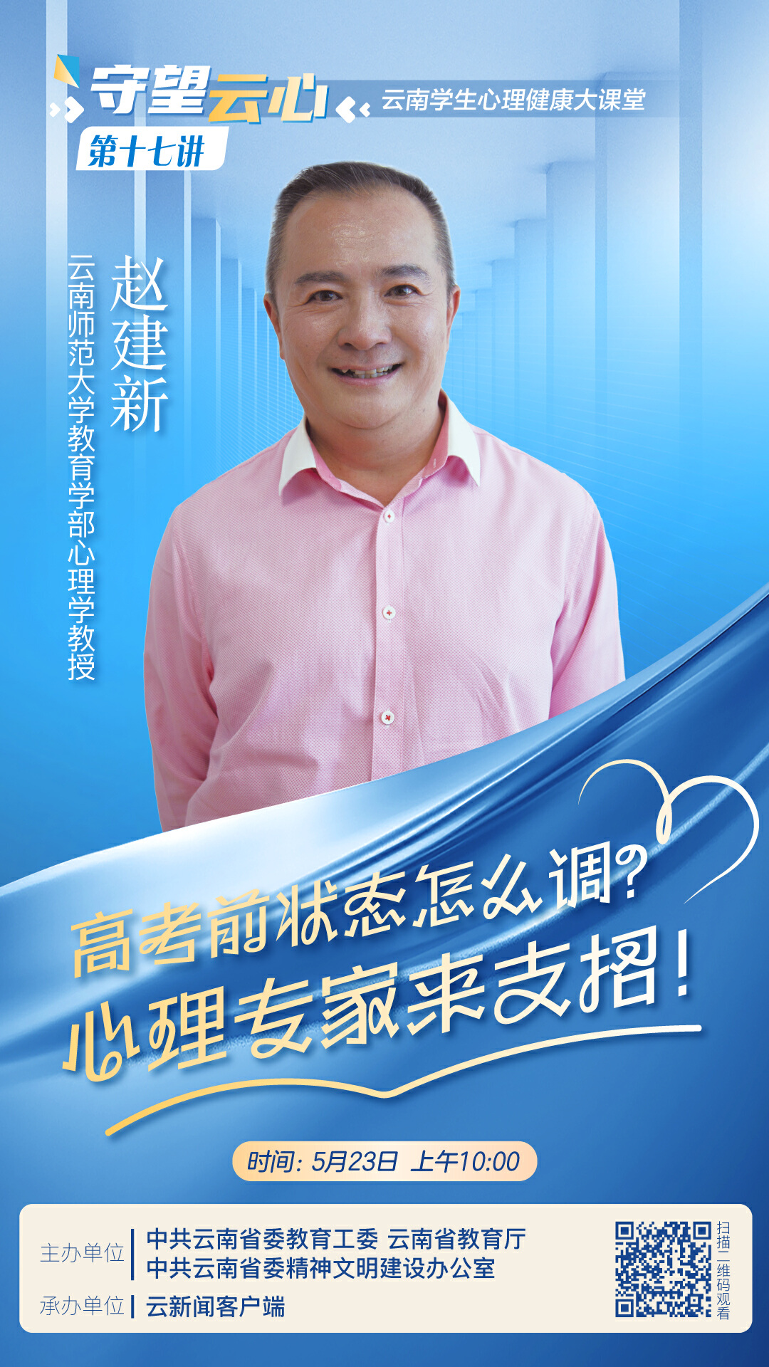 上期,“守望云心”云南學生心理健康大課堂邀請了云南師范大學心理學教授專家趙建新與大家聊了“考前綜合征”的表現和調整,本期趙老師聚焦高考學生身體和心理的調適,為考生支招,快來看看吧!