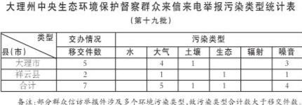 5月28日,中央第七生態(tài)環(huán)境保護(hù)督察組向云南移交第十九批群眾信訪(fǎng)舉報(bào)件,其中涉及大理州7件,來(lái)電舉報(bào)6件,來(lái)信舉報(bào)1件。從信訪(fǎng)舉報(bào)件生態(tài)環(huán)境問(wèn)題類(lèi)型來(lái)看,涉及大氣5件、土壤1件、生態(tài)1件、噪音4件(部分信訪(fǎng)舉報(bào)件涉及多個(gè)環(huán)境污染類(lèi)型)。從區(qū)域分布上看,大理市5件、祥云縣2件。截至當(dāng)日,大理州已累計(jì)收到中央第七生態(tài)環(huán)境保護(hù)督察組交辦的信訪(fǎng)舉報(bào)件137件,所有舉報(bào)件均已及時(shí)轉(zhuǎn)交相關(guān)縣(市)處理。