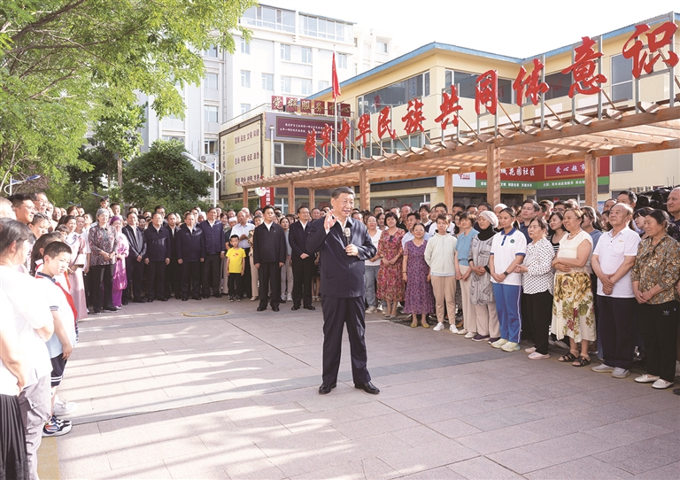 傍晚時(shí)分,社區(qū)廣場(chǎng)十分熱鬧,居民們看見總書記來了,紛紛圍攏過來,熱烈鼓掌歡迎。習(xí)近平親切地對(duì)大家說,時(shí)隔4年,我再次來寧夏看望各族干部群眾,見到大家非常高興!中華民族是一個(gè)大家庭,各族人民要像石榴籽一樣緊緊抱在一起。要不斷鑄牢中華民族共同體意識(shí),把各族人民的心緊緊連在一起,把各方面的力量廣泛凝聚到一起,共同推進(jìn)中國(guó)式現(xiàn)代化,共襄中華民族偉大復(fù)興的盛舉。