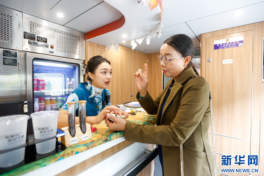 餐吧車內(nèi),依波逢為老撾旅客講解特色美食(攝于6月17日)。新華網(wǎng) 徐華陵 攝