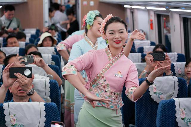 2023年4月13日,工作人員在中國西雙版納至老撾瑯勃拉邦首發列車上表演。新華社記者 王靜頤 攝
