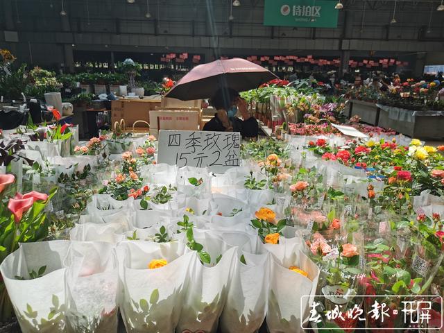 成捆的玫瑰、康乃馨、非洲菊、洋桔梗……