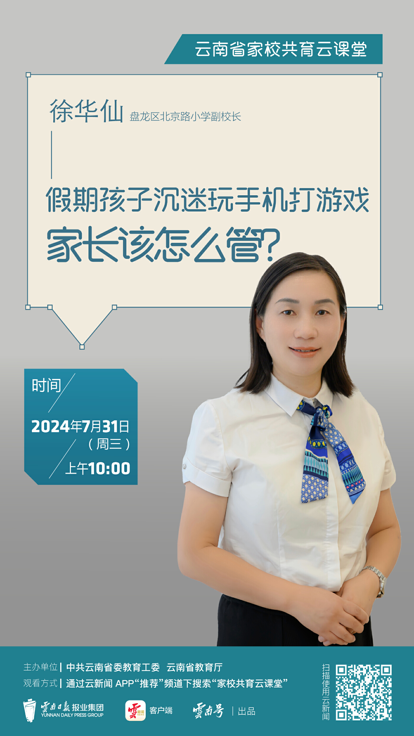 暑期放假,不少家長正在為孩子沉迷玩手機、打游戲的問題而苦惱,7月31日上午10:00,云南家校共育云課堂第七期——《假期孩子沉迷玩手機打游戲,家長該怎么管?》在云新聞客戶端上線,本期邀請昆明市盤龍區(qū)北京路小學副校長徐華仙老師,與大家聊聊假期孩子沉迷玩手機、打游戲,父母怎么辦?一起來看看吧!