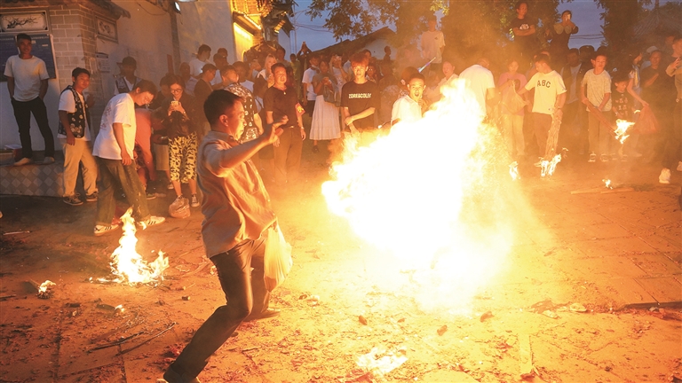 吃過晚飯,村中心擠滿了人,年輕力壯的小伙子們將大火把豎好。隨后,豎火把的家庭便把自家的孩子抱到火把旁開始了祈福儀式。舞臺(tái)上的洞經(jīng)古樂與白族霸王鞭等節(jié)目相繼上演,村子里滿18歲的青年舉行成人禮……到了點(diǎn)火的時(shí)刻,村里青年取出火種,利用長桿慢慢將火種靠近火把頂端,最終將大火把點(diǎn)燃。霎時(shí),烈焰騰空,鞭炮齊鳴,場面壯觀,節(jié)日的高潮由此開始。