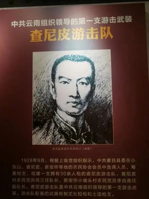 1928年5月,查尼皮成立了農民協會,后改名為農民聯合會,并迅速發展成為迤南農村工作的活動中心。1928年9月,根據省臨委“準備武裝暴動”的指示精神,黨組織建立了查尼皮武裝游擊隊。游擊隊共有30多人,均配備了槍支,隊長是查尼皮村民佴三。1929年底,查尼皮游擊隊消滅了麥沖的地霸武裝,有力地打擊了沿途土匪勢力。