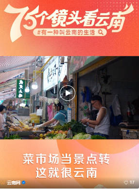 為獻禮中華人民共和國成立75周年,云南網聯合云南發布、“學習強國”云南學習平臺共同策劃推出“喜迎新中國成立75周年 75個鏡頭帶你看云南”融媒專欄,在7月18日至9月30日期間,一天一推,連續推出75條短視頻,聚焦最具云南味兒的山、水、風、物、人,用細膩鏡頭、新穎表達、明快節奏、酷炫畫面,再現最奇特的山水風光、最地道的民族風情、最深厚的文化底蘊、最絢麗的民間藝術、最原汁原味的美食,全方位展現“有一種叫云南的生活”。今天,請看第三十四期——《菜市場當景點轉,這就很云南》。