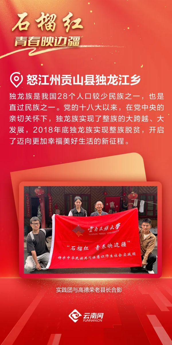 獨龍族實現整族脫貧和獨龍江推進民族團結進步創建的實踐與經驗,是云南省建設我國民族團結進步示范區的生動縮影,對于推動邊疆民族地區發展、鑄牢中華民族共同體意識,促進各民族像石榴籽一樣緊緊抱在一起,具有十分重要的意義。作為新時代的青年,我們要時刻牢記習近平總書記的囑托,在強國建設、民族復興的新征程上,推動鑄牢中華民族共同體意識,為建設好家鄉、守護好邊疆貢獻青春力量。