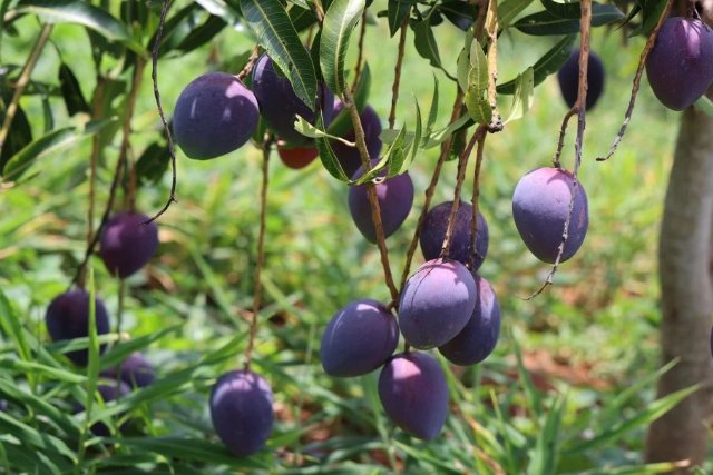 普洱墨江縣,聯珠鎮壩洛村芒果種植基地里,一串串圓滾滾的紫芒果掛滿枝頭。