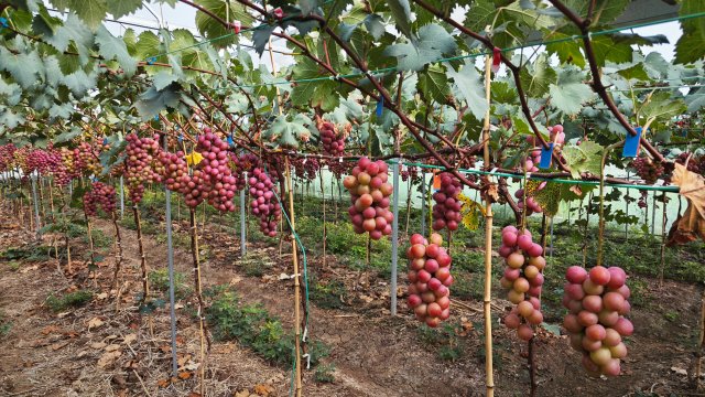 玉溪通??h,秀山街道大樹社區的一處種植基地里,被譽為葡萄界的“愛馬仕”,有著“樹上公主、樹下皇后”美譽的“妮娜皇后”陸續成熟,新鮮上市。