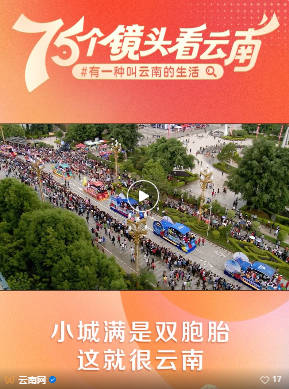 為獻禮中華人民共和國成立75周年,云南網聯合云南發(fā)布、“學習強國”云南學習平臺共同策劃推出“喜迎新中國成立75周年 75個鏡頭帶你看云南”融媒專欄,在7月18日至9月30日期間,一天一推,連續(xù)推出75條短視頻,聚焦最具云南味兒的山、水、風、物、人,用細膩鏡頭、新穎表達、明快節(jié)奏、酷炫畫面,再現最奇特的山水風光、最地道的民族風情、最深厚的文化底蘊、最絢麗的民間藝術、最原汁原味的美食,全方位展現“有一種叫云南的生活”。今天,請看第六十四期——《小城滿是雙胞胎,這就很云南》。