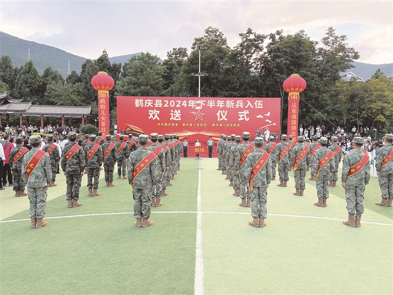本報(bào)訊(通訊員 楊雪松 文/圖) 9月14日晚,鶴慶縣2024年下半年新兵入伍歡送儀式在森林公園運(yùn)動(dòng)場(chǎng)舉行。39名義務(wù)兵、3名直招軍士光榮入伍。