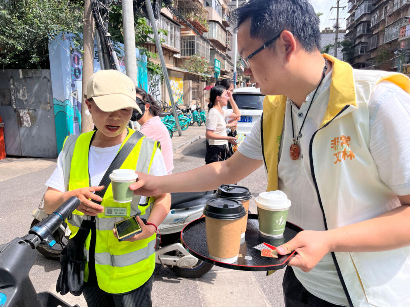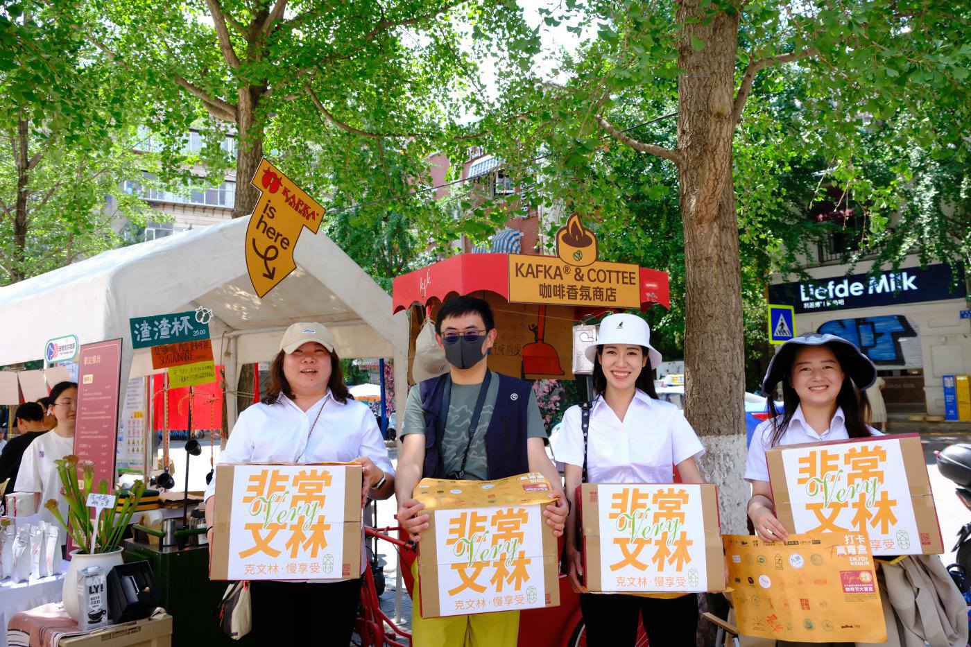 在這樣的情況下,經濟工作與群眾工作緊密相連。在社區黨委指導、街區黨支部策劃、商戶參與下、居民支持下,以商戶為主的自治組織成立并取名“非常文林”,約定黨建引領、誠信經營、共治共享等規則,以及活動引流、文化引流經營策略,共同策劃開展活動。同時設計出了街區游玩攻略路線圖,以黨員業主、商店老板為原型設計了卡通人物明信片、書簽等文創產品,并贈送給街區游人、商戶居民,文林街片區商居融合發展有了形象標識和推廣載體。爾后,“巷巷美術館”、人間四月天讀書會、圖書漂流等文化載體從無到有、出新出彩,街區人氣越來越旺。2024夏季文林街咖啡文化節,更是將街區人氣推向了高潮,30多家咖啡店參與進來,日營業額最高增長了約5倍。