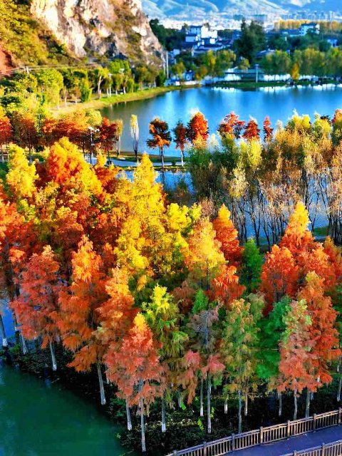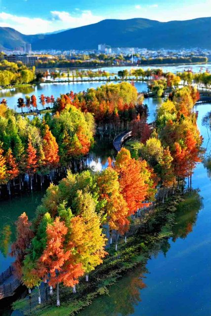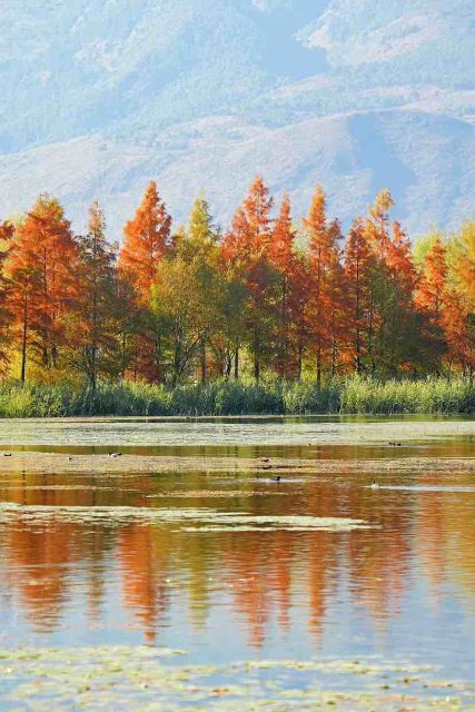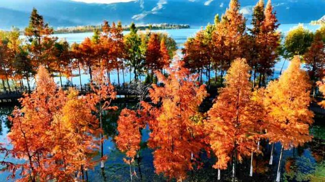 大理州茈碧湖的水杉被譽為“水上森林”,每年11月末至12月初,水杉林的樹葉開始變幻出多種色彩,從翠綠逐漸過渡到金黃,再到深紅,最終呈現出一幅豐富多彩的自然畫卷。