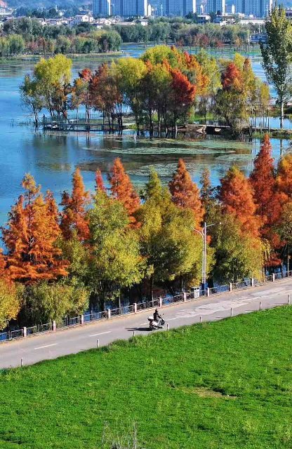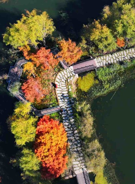 水杉的紅色、黃色和淺黃色的樹葉,如同調色盤上的色彩,隨意揮灑,構成了一幅無需雕琢的自然藝術作品。