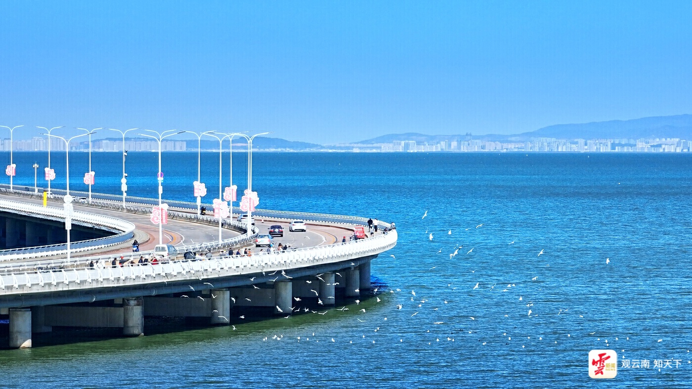 城外,南滇池濕地延展無垠,波光粼粼中映照著天空的蔚藍(lán),候鳥翩躚,或低飛掠過水面,或高歌于枝頭,它們的歡聲笑語,是冬日里最靈動的樂章。