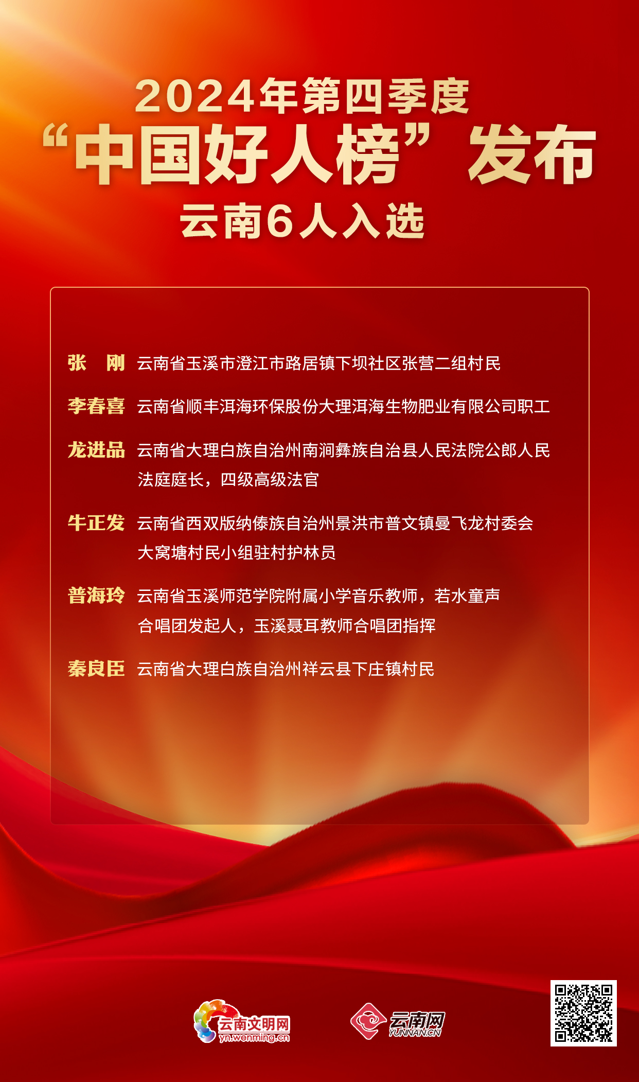 云南網(wǎng)訊(記者徐顏蓉蓉)1月15日上午,2024年第四季度“中國(guó)好人榜”在云南省大理白族自治州正式發(fā)布,云南6人光榮上榜。祝賀他們!