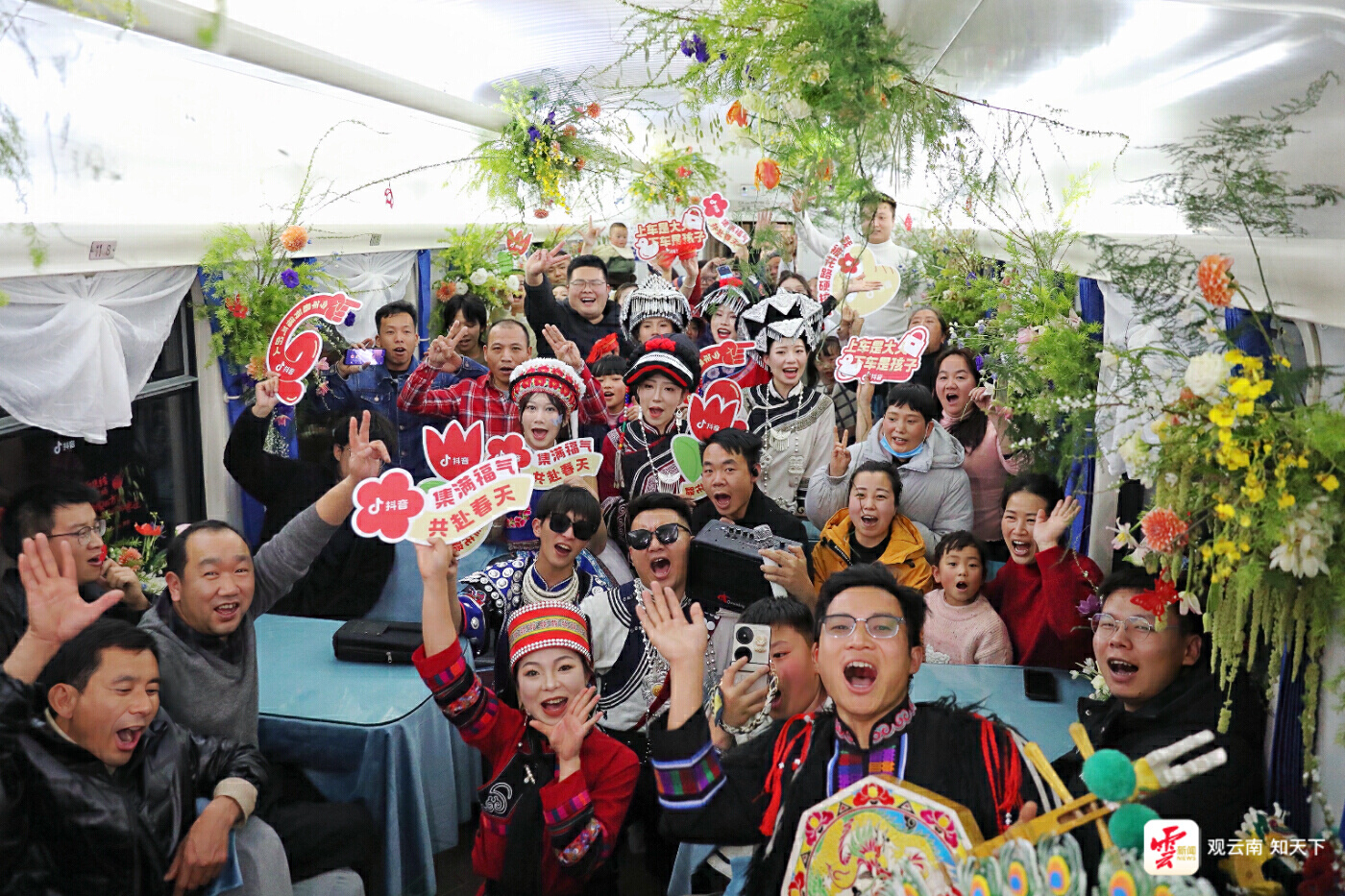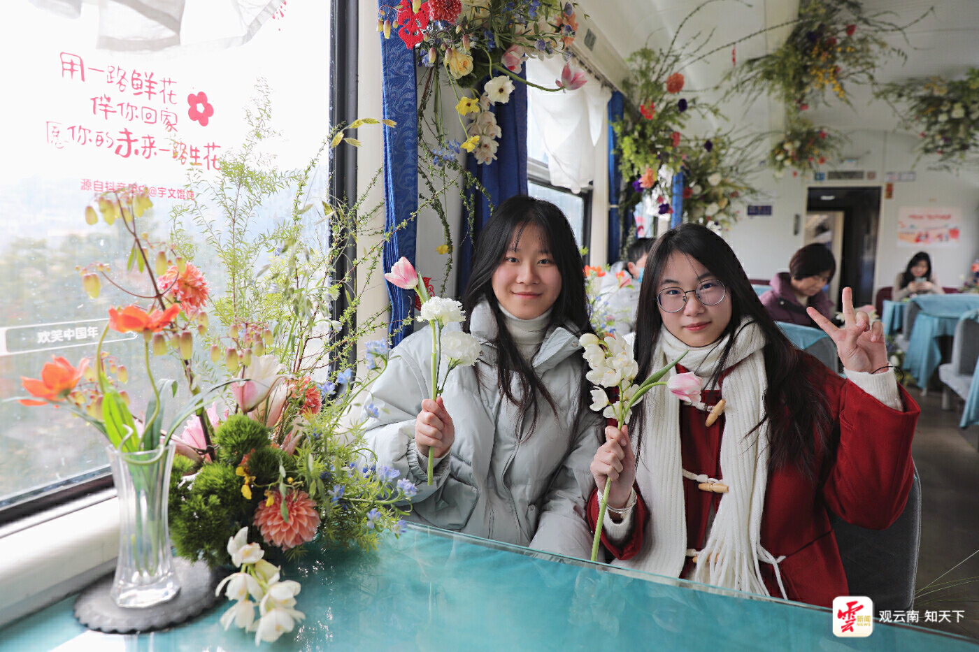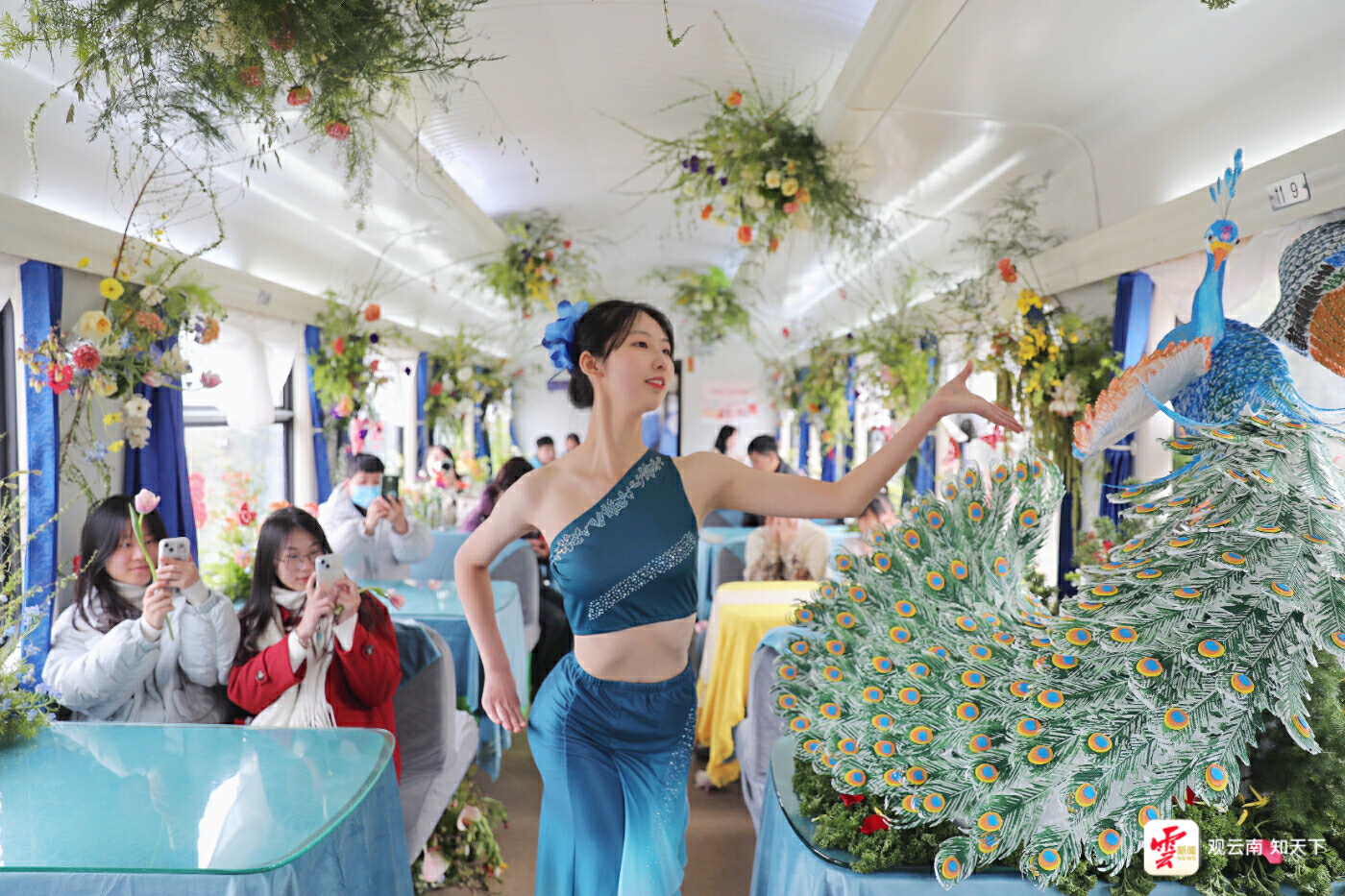 “福氣列車”采用雪柳花、玫瑰、郁金香等十幾種近千枝鮮花進行裝飾,車窗上貼滿了年味十足的個性窗花,還有少數(shù)民族青年進行“花樣旅途”民族歌舞表演。“云南的浪漫在此刻具象化了!”李琳豎起大拇指贊嘆道。