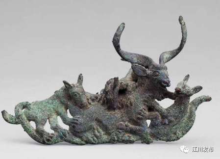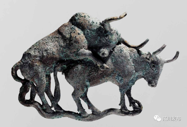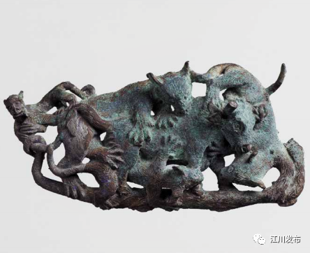 整體略呈長方形,透空浮雕的一牛一虎一豹立于一蛇之上。虎撲于牛后背,張口作欲噬狀;豹低身咬住牛前腿,尾卷于牛左角上;牛身體前傾,后腿微曲,張口嚎叫掙扎,尾巴揚于虎后背上。背面有一矩形扣。