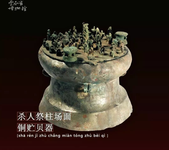高38厘米,器蓋直徑30厘米,為銅鼓形貯貝器,有蓋有底,內存海貝。鼓的腰部刻有8人,各手持矛、弩或斧等兵器在奔跑狩獵。蓋子中間立有一高9厘米的柱子,兩條蛇盤旋其上,柱頂有一只老虎。鼓上祭祀場景中共有52人,場景展現為正在進行過程中的祭禮。